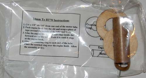 Motor tube, engine block, engine hook, and two laser-cut plywood centering rings for mounting a single 24mm motor in a standard BT-70 body tube.