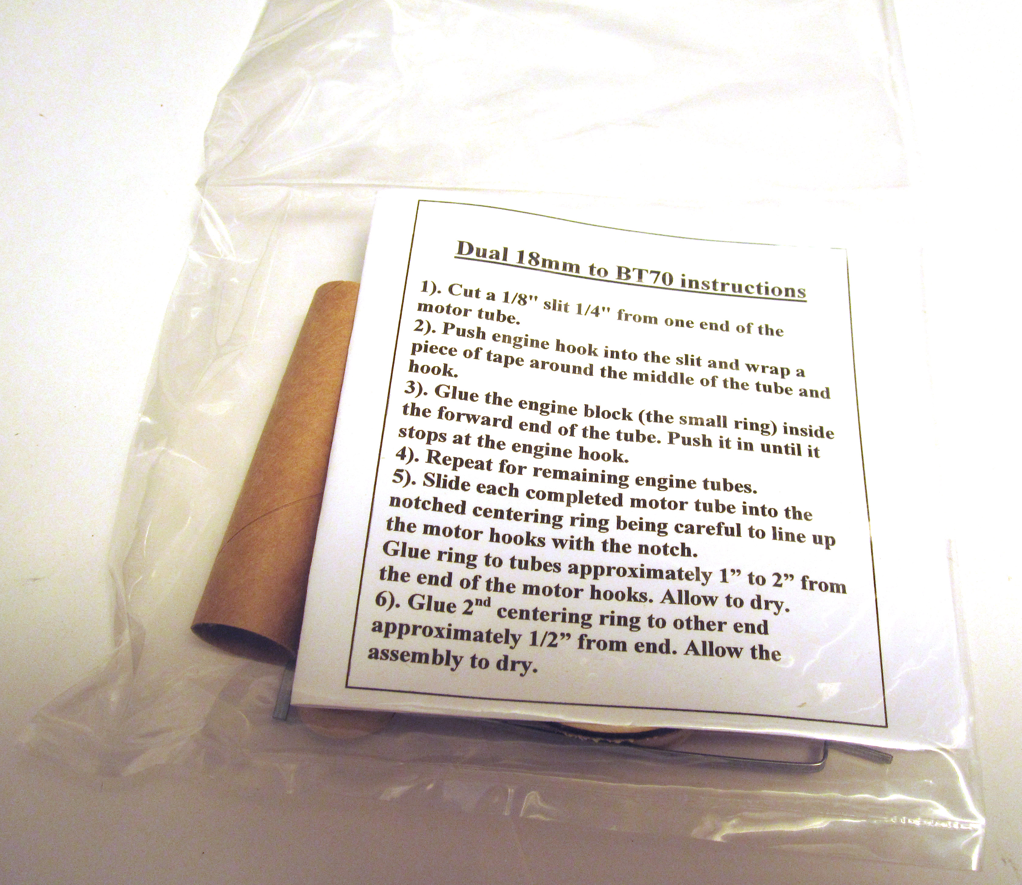 Motor mount kit for mounting a cluster of two 18mm motors in a BT-70 body tube.