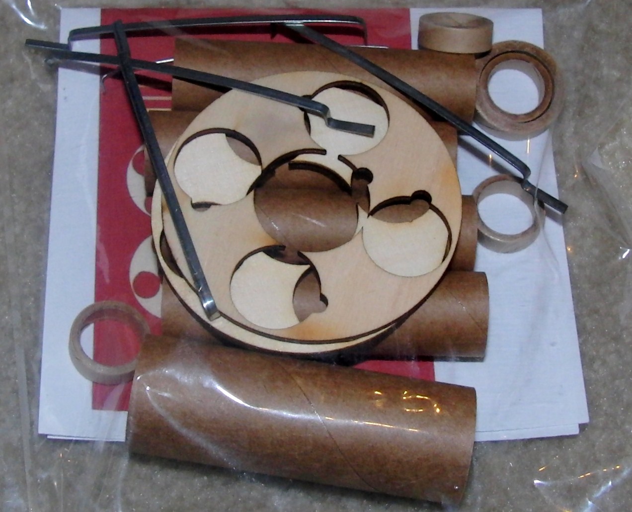 Motor mount kit for four 18mm motors clustered around a central 24mm motor in a standard BT-80 body tube. Includes five motor tubes, two laser-cut plywood centering rings, engine hooks, motor blocks, and instructions.