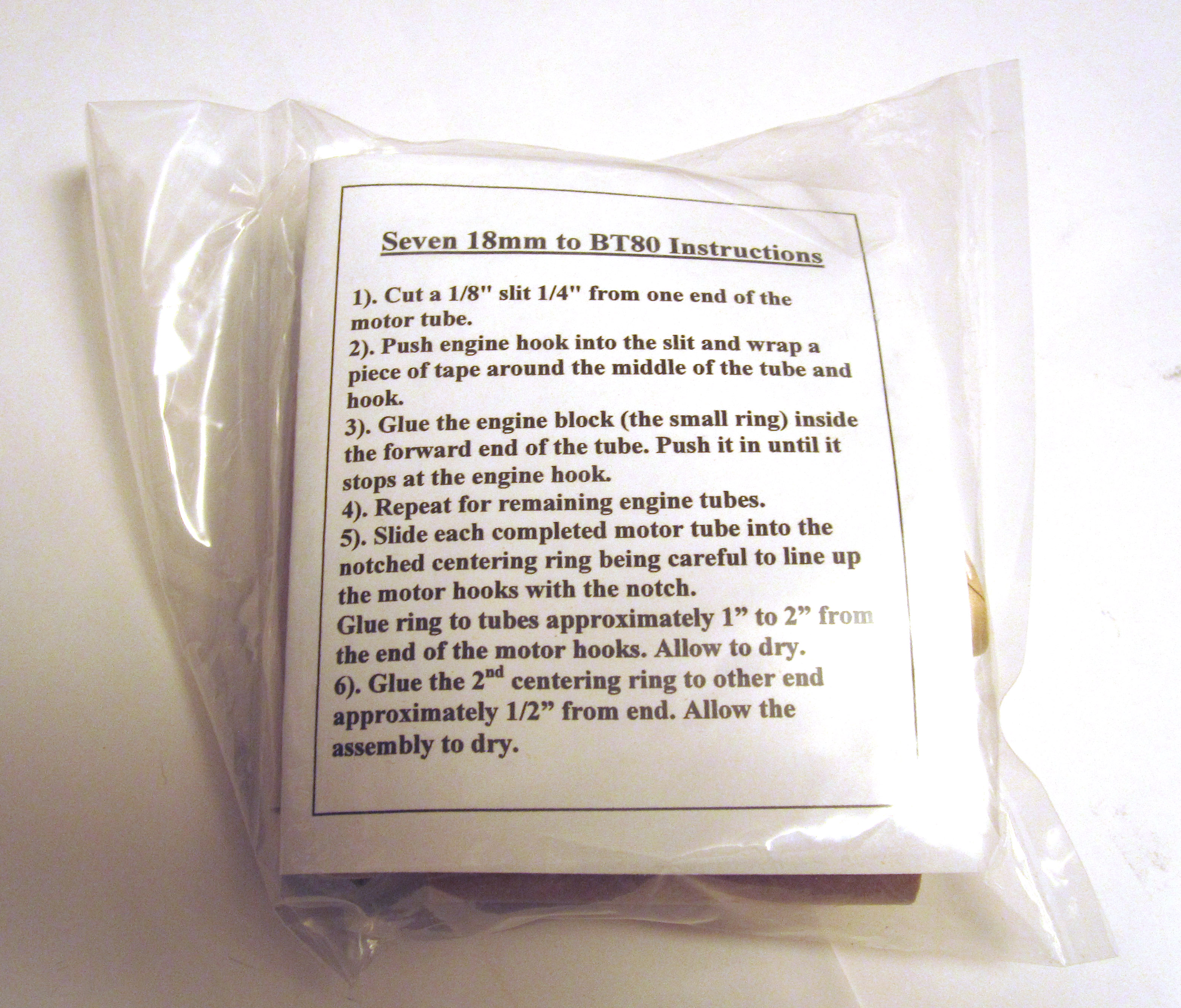 Motor mount kit for clustering seven 18mm motors in a BT-80 body tube.